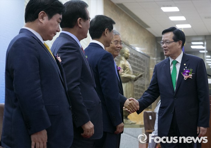 (서울=포커스뉴스) 27일 오전 서울 여의도 국회에서 68주년 국회 개원 기념식을 마친 정의화 국회의장이 정당 참석자들과 인사하고 있다. 오른쪽부터 정 의장, 김종인 더불어민주당 비대위 대표, 천정배 국민의당 공동대표, 정갑윤, 이석현 국회 부의장.