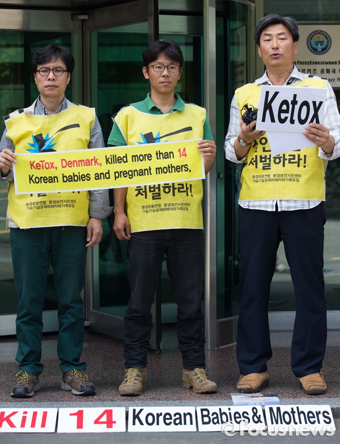 (서울=포커스뉴스) 환경보건시민센터 관계자들이 27일 오전 서울 용산구 주한 덴마크대사관 앞에서 가습기살균제 사건 관련 덴마크 정부 행동 촉구 항의서한 전달 기자회견을 하고 있다.