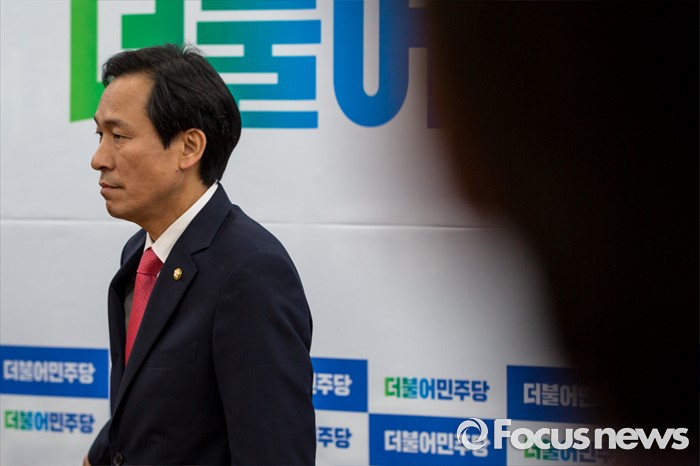 (서울=포커스뉴스) 우상호 더불어민주당 원내대표가 27일 오전 서울 여의도 국회에서 국회법 개정안 관련 대통령 거부권 행사에 대해 입장발표를 하기 위해 회의실로 들어서고 있다.