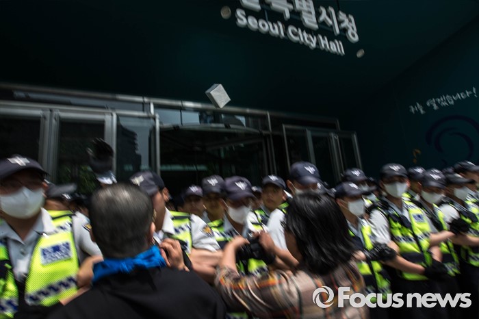 (서울=포커스뉴스) 27일 오전 서울 중구 서울시청 정문 앞에서 삭발식을 끝낸 전국장애인 부모연대와 서울특수학교학부모협의회 회원들이 박원순 서울시장에게 전달하려 시청 진입을 시도하다 경찰에 가로막히자 머리카락이 담긴 박스를 시청 안으로 던지고 있다.