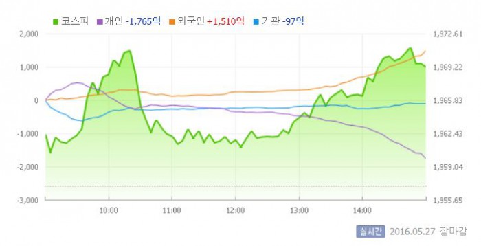 이날 일본 닛케이225지수는 전일 대비 0.4% 오른 1만6834.84에 마감했다.27일 유가증권시장 <그래픽출처=네이버>