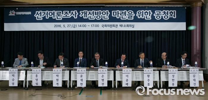 (서울=포커스뉴스) 27일 오후 서울 여의도 국회 의원회관에서 중앙선거관리위원회 주최로 열린 선거여론조사 개선방안 마련을 위한 공청회에 참석한 패널들이 토론을 하고 있다. 왼쪽부터 박승열 월드리서치 대표, 홍영림 조선일보 여론조사 팀장, 박범계 더불어민주당 의원, 윤재현 중앙선거여론조사공점심이의원회 사무국장, 손병권 중앙대 교수, 이종배 새누리당 의원, 황주홍 국민의당 의원, 성한용 한겨레신문 선임기자, 김대진 조원씨앤아이 대표.