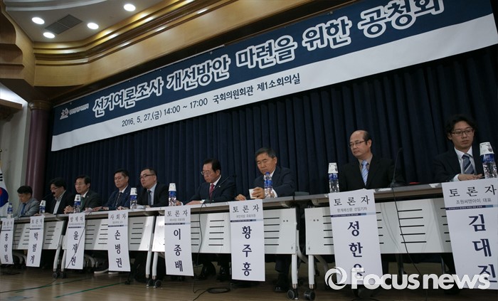 (서울=포커스뉴스) 27일 오후 서울 여의도 국회 의원회관에서 중앙선거관리위원회 주최로 열린 선거여론조사 개선방안 마련을 위한 공청회에 참석한 패널들이 토론을 하고 있다. 왼쪽부터홍영림 조선일보 여론조사 팀장, 박범계 더불어민주당 의원, 윤재현 중앙선거여론조사공점심이의원회 사무국장, 손병권 중앙대 교수, 이종배 새누리당 의원, 황주홍 국민의당 의원, 성한용 한겨레신문 선임기자, 김대진 조원씨앤아이 대표.
