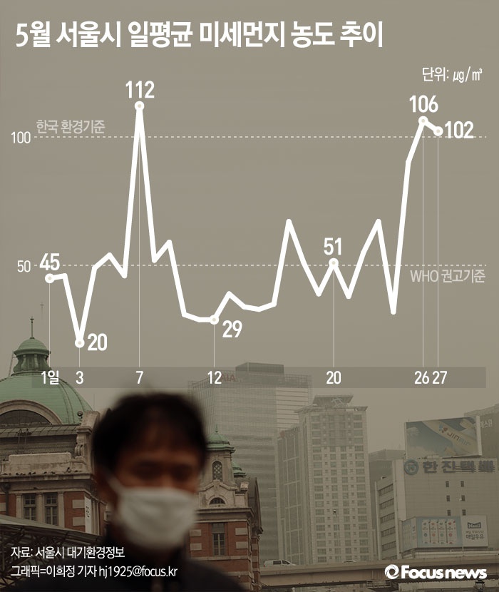 (서울=포커스뉴스) 최근 건강을 위협하는 미세먼지가 지속적으로 발생하고 있다. 세계보건기구(WHO) 기준(50㎍/㎥)과 한국 환경기준(100㎍/㎥)이 두 배 나 차이나 한국 미세먼지 기준 강화 방안이 거론되고 있다. 5월 27일 기준 서울시 하루평균 미세먼지 농도는 102㎍/㎥로 측정됐다.