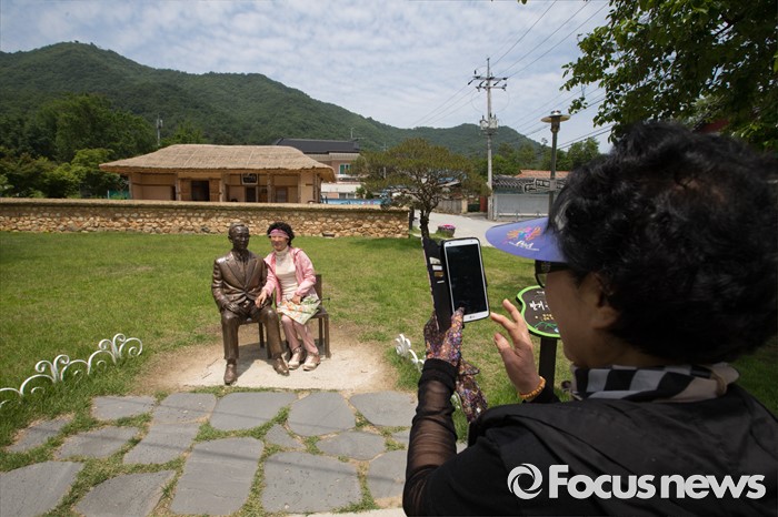 (음성=포커스뉴스) 관광객들이 27일 오후 충북 음성군 원남면 반기문 UN사무총장 생가 앞에 설치된 동상과 기념촬영하고 있다.