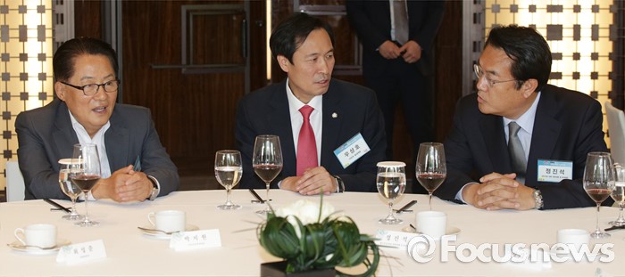 (서울=포커스뉴스) 27일 오후 서울 웨스틴 조선호텔에서 열린 2016 한반도통일 심포지엄 기념 오찬에 참석한 정진석(오른쪽부터) 새누리당 원내대표, 우상호 더불어민주당 원내대표, 박지원 국민의당 원내대표가 대화하고 있다.