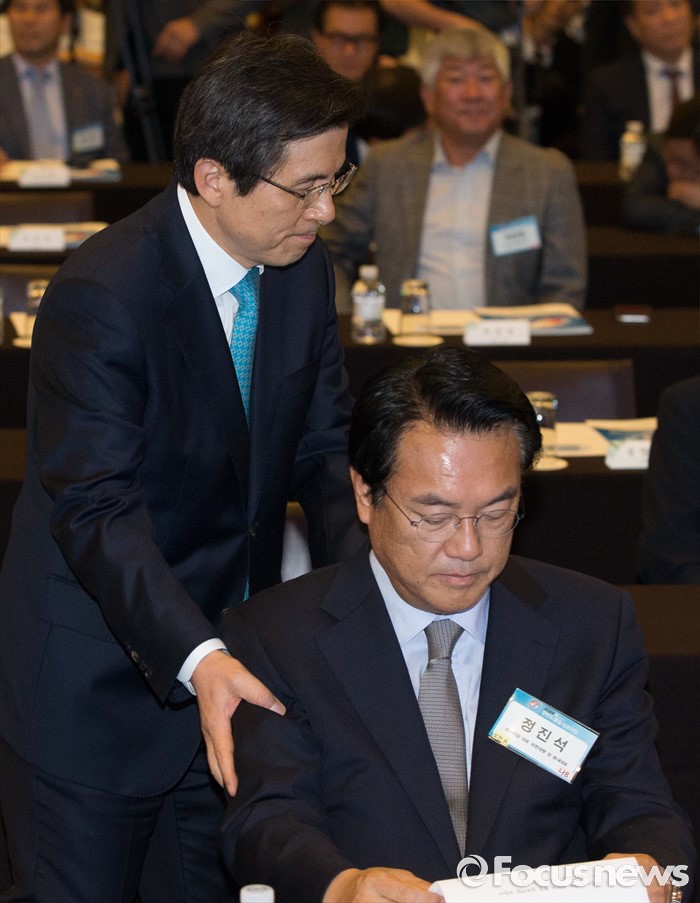 (서울=포커스뉴스) 27일 오후 서울 웨스틴 조선호텔에서 열린 2016 한반도통일 심포지엄에 참석한 황교안(왼쪽) 국무총리와 정진석 새누리당 원내대표가 인사하고 있다.