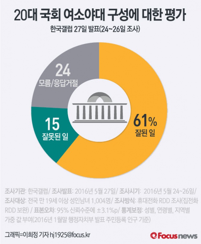 (서울=포커스뉴스) 한국갤럽이 지난 24~26일 3일간 실시한 여론조사 결과에 따르면 20대 국회 여소야대 구성에 대해 응답자의 61%가 '잘된 일', 15%가 '잘못된 일'이라고 평가한 것으로 집계됐다.