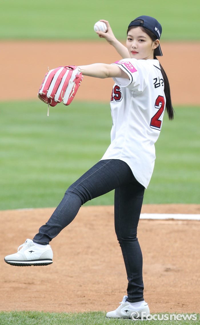(서울=포커스뉴스) 27일 서울 잠실구장에서 열린 2016 프로야구 LG-두산 경기에 앞서 배우 김유정이 시구하고 있다.