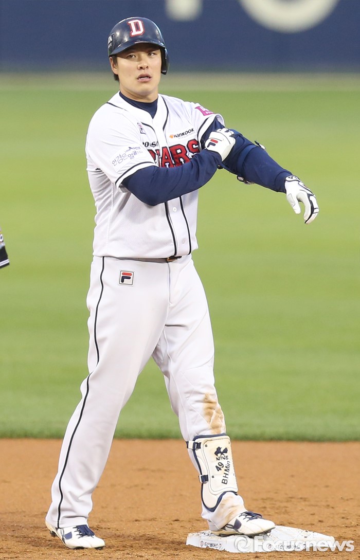 (서울=포커스뉴스) 27일 서울 잠실구장에서 열린 2016프로야구 LG-두산 경기 2회말 2사 2루에서 두산 민병헌이 우익수 오른쪽에 떨어지는 2루타를 치고 2루 베이스 위에 서있다.