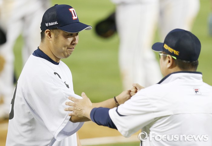 (서울=포커스뉴스) 27일 서울 잠실구장에서 열린 2016프로야구 LG-두산 경기에서 LG에 승리한 두산 승리투수 유희관이 김태형 감독의 축하를 받고 있다.