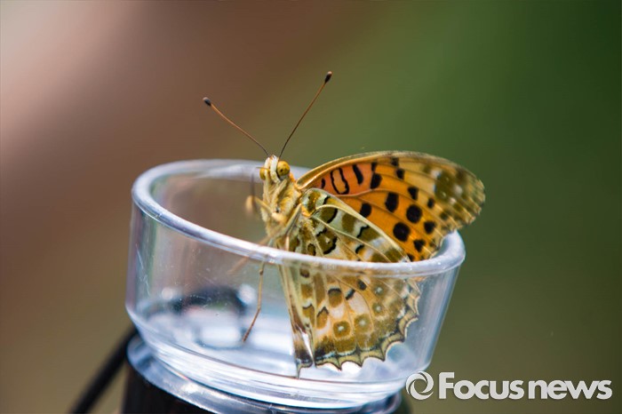(서울=포커스뉴스) 28일 오전 나비 특별 체험전이 열리고 있는 서울 성동구 서울숲 나비정원에 한 아이의 물건에 나비 한 마리가 앉아있다.