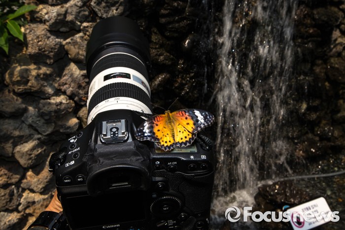 (서울=포커스뉴스) 28일 오전 나비 특별 체험전이 열리고 있는 서울 성동구 서울숲 나비정원에서 나비 한마리가 기자의 카메라에 앉아 있다.