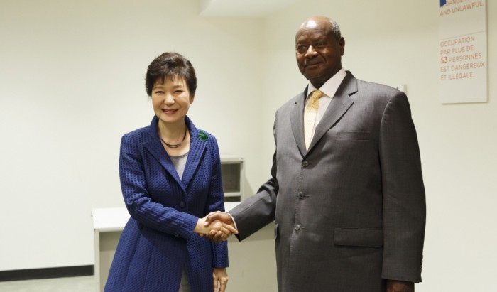 30일 다음 방문국인 케냐로 이동하는 박 대통령은 우후루 케냐타 케냐 대통령과의 정상회담을 갖고 우리 기업의 케냐 진출 방향에 대한 논의 등을 진행할 계획이다. 박 대통령은 아프리카 3개국 순방을 마친 뒤, 6월1일 프랑수아 올랑드 대통령의 초청으로 프랑스를 국빈방문한다.박근혜 대통령이 29일 요웨리 무세베니 우간다 대통령과 정상회담을 개최한다. 사진은 2014년 미국 뉴욕 유엔본부에서 정상회담을 하기 앞서 기념촬영 중인 양국 정상. 2014.09.23. <사진출처=청와대>