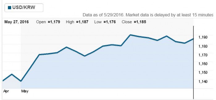 만약 오는 6월3일 발표 예정인 5월 미국 비농업부문 고용자 수도 예상치와 부합하거나 증가세를 이어갈 경우, 6월 금리 인상설에 무게가 쏠리면서 원화 가치는 크게 하락할 가능성이 높다. 앞서 4월 비농업부문 고용자수는 16만명 늘었고, 시장은 5월 고용자수도 4월과 동일한 16만명 증가로 점치는 상황이다.