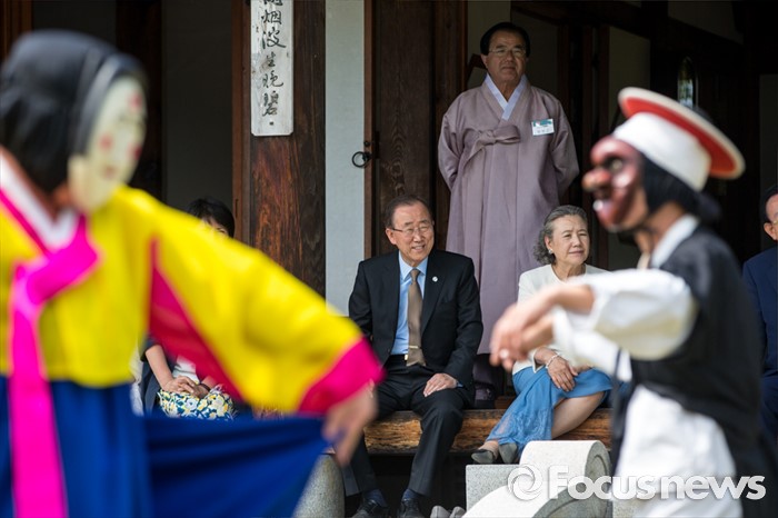 (안동=포커스뉴스) 반기문 UN 사무총장이 29일 오후 경북 안동시 하회마을 방문 하회별신굿탈놀이를 보고 있다.