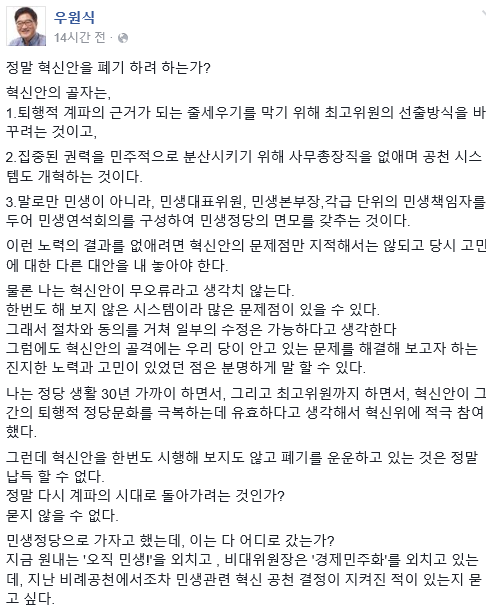 더불어민주당은 지난해 문재인 전 대표 시절, 사무총장제·최고위원제 폐지 등을 골자로 하는 혁신안을 내놓았다. 그러나 최근 당내에서 전당대회 준비위원회를 중심으로 혁신안을 폐기하려는 듯한 움직임이 보이자 당시 혁신위에 참여했던 우원식 의원이 이를 비판하고 나선 것.