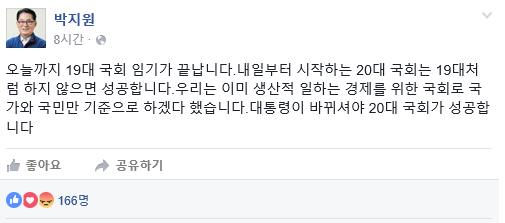 박 원내대표는 이날 오전 자신의 페이스북을 통해 이같이 밝히며 "내일부터 시작하는 20대 국회는 19대처럼 하지 않으면 성공한다"고 말했다.