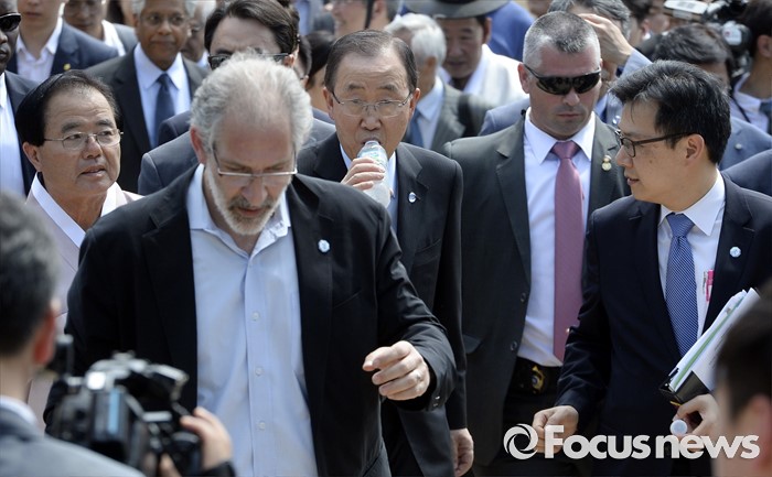 (안동=포커스뉴스) 29일 오후 경북 안동 하회마을을 방문한 반기문 유엔 사무총장이 이동하며 물을 마시고 있다.