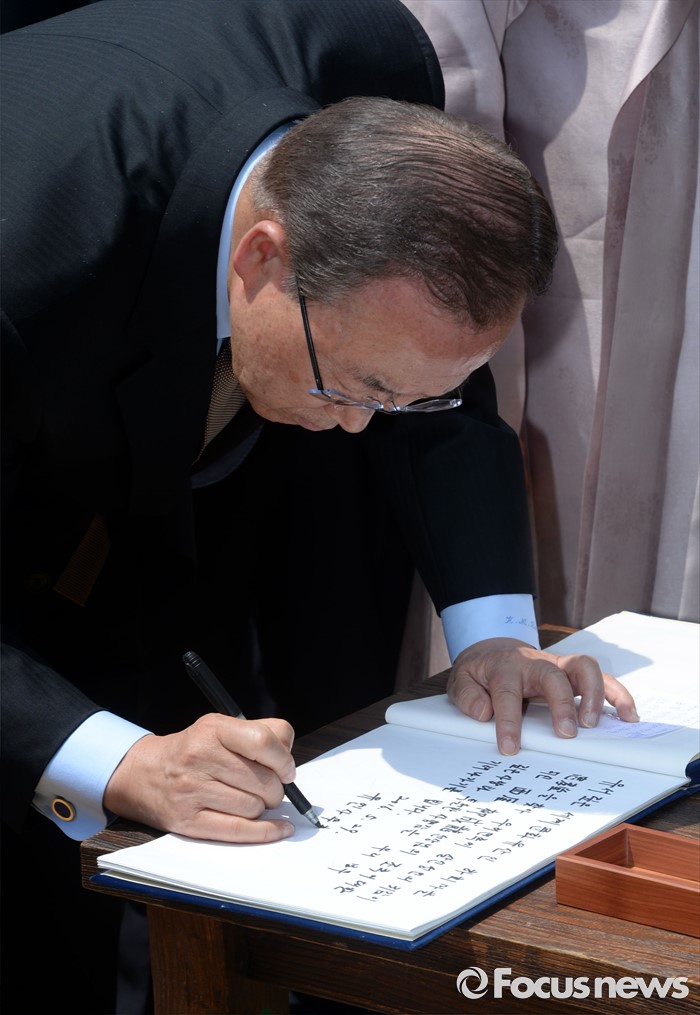 (안동=포커스뉴스) 반기문 유엔 사무총장이 29일 오후 경북 안동 하회마을 성애 류성룡 고택 충효당에서 방명록을 작성하고 있다.