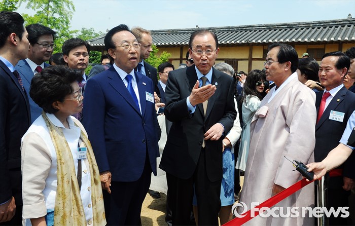 (안동=포커스뉴스) 반기문 유엔 사무총장이 29일 오후 유네스코 세계문화유산으로 등재된 경북 안동 하회마을을 방문해 엘리자베스2세 영국 여왕의 기념 식수를 구경하고 있다.