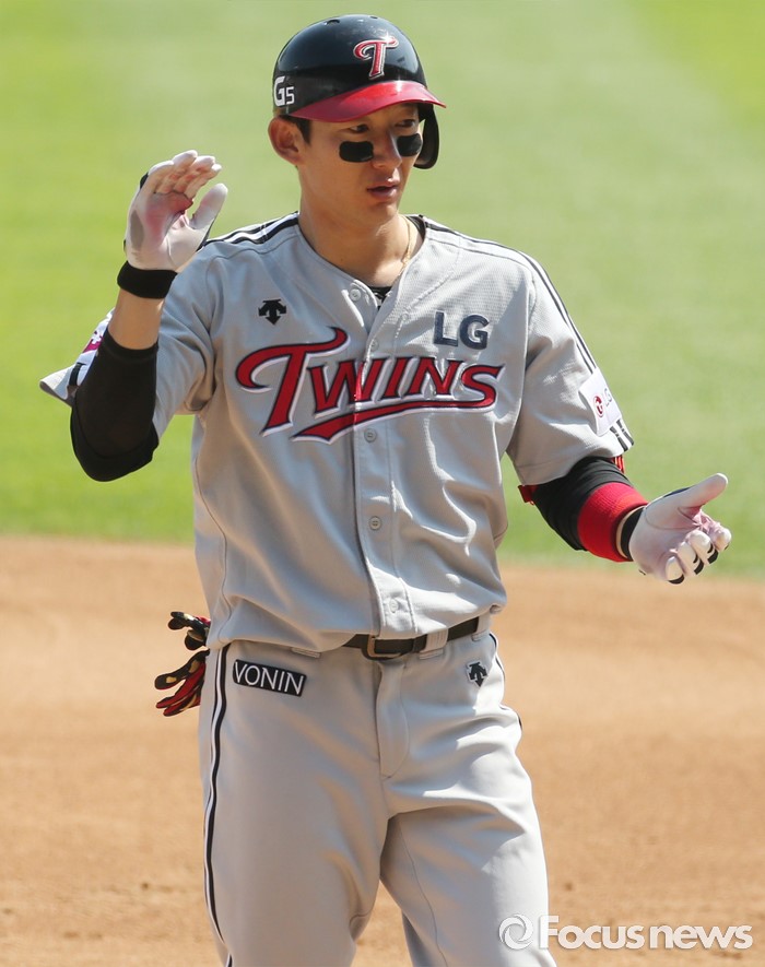 (서울=포커스뉴스) 29일 서울 잠실구장에서 열린 2016프로야구 LG-두산 경기 3회초 2사 1,3루에서 LG 손주인이 우중간 동점 안타를 치고 기뻐하고 있다.
