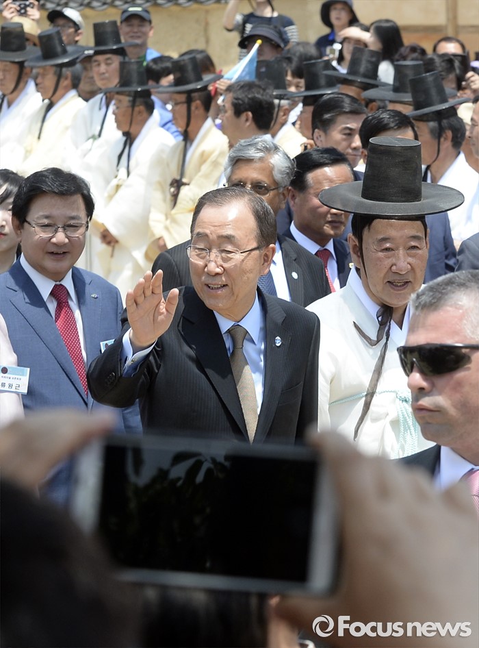 (안동=포커스뉴스) 29일 오후 경북 안동 하회마을을 방문한 반기문 유엔 사무총장이 식수를 위해 이동하며 시민들을 향해 손을 흔들고 있다.