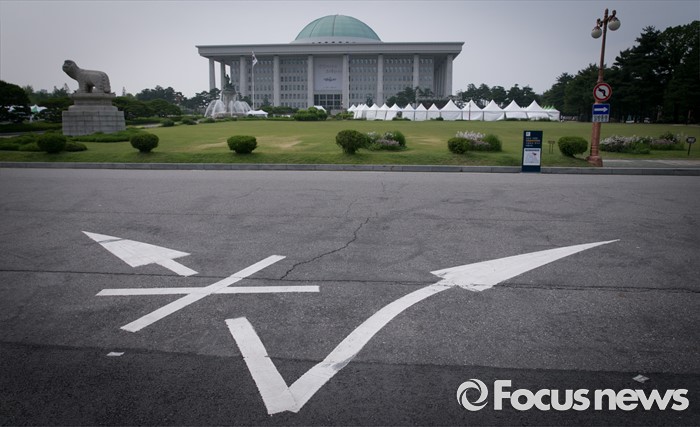더불어민주당, 국민의당, 정의당 등 야3당이 20대 국회에 국회법 개정안 재의결을 추진하며 공동대응에 나선 가운데 '협치'에 의한 출발 역시 불투명해진 셈이다.19대 국회가 29일 종료됐다. 정부가 상시청문회 등의 내용이 포함된 국회법 개정안에 대한 거부권 행로 정국이 얼어붙은 가운데 사진은 지난 27일 오후 서울 여의도 국회 경내 도로에 양갈래로 표시된 화살표가 보이는 모습. 2016.05.27 박동욱 기자