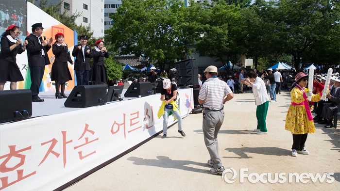 (서울=포커스뉴스) 29일 오후 서울 종로구 교동초등학교에서 열린 '2016 효자손 어르신 대축제'에 참석한 어르신들이 무대 앞에서 춤을 추고 있다.