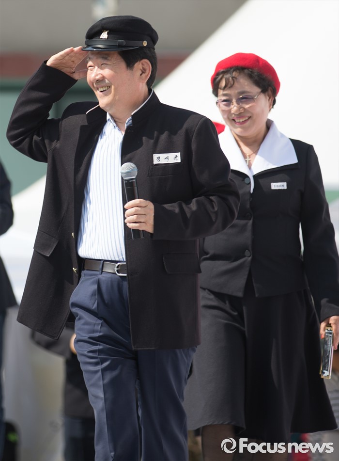 (서울=포커스뉴스) 정세균 더불어민주당 의원이 29일 오후 서울 종로구 교동초등학교에서 열린 '2016 효자손 어르신 대축제'에 참석해 옛 고등학교 교복과 모자를 쓰고 무대를 오르고 있다.