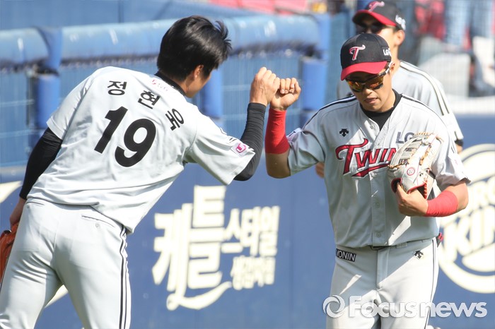 (서울=포커스뉴스) 29일 서울 잠실구장에서 열린 2016프로야구 LG-두산 경기에서 4회말 2사 1루에서 두산 민병헌의 외야플라이를 다이빙하며 잡은 LG 채은성을 투수 정현욱이 맞이하고 있다.
