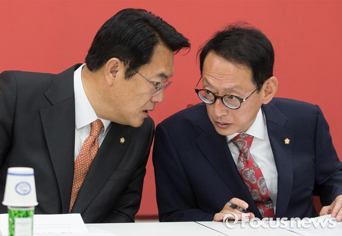 (서울=포커스뉴스) 정진석(왼쪽) 새누리당 원내대표와 김도읍 원내수석부대표가 30일 오전 서울 여의도 국회에서 열린 원내대표단회의에 참석해, 대화하고 있다.