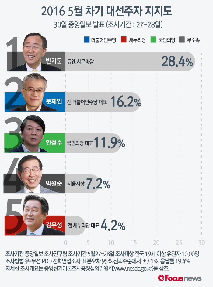 (서울포커스뉴스) 중앙일보가 30일 발표한 차기 대선주자 지지도 여론조사(중앙일보 조사연구팀 5월 27~28일) 결과에 따르면 반기문 유엔 사무총장이 28.4%의 지지율로 선두를 기록했다.