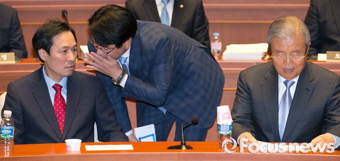 (서울=포커스뉴스) 20대 국회 임기가 시작된 30일 오전 서울 여의도 국회에서 열린 더불어민주당 의원총회에 참석한 우상호(왼쪽) 원내대표와 박용진(가운데) 대표비서실장이 대화하고 있다. 오른쪽은 김종인 비대위 대표.