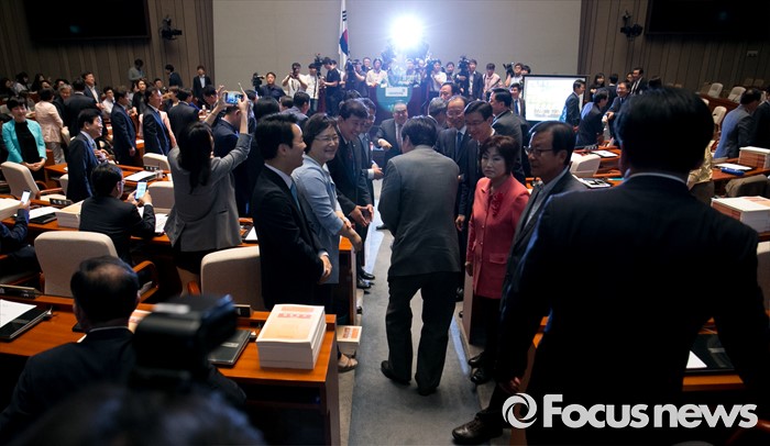 (서울=포커스뉴스) 20대 국회 임기가 시작된 30일 오전 서울 여의도 국회에서 열린 더불어민주당 의원총회에 참석한 의원들이 서로 인사하고 있다.