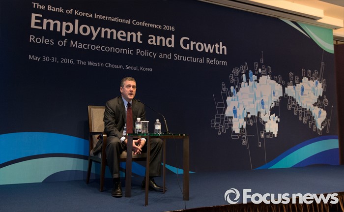 (서울=포커스뉴스) 30일 오전 서울 중구 웨스틴조선호텔에서 열린 2016 한국은행 국제컨퍼런스에서 제임스 불라드 세인트루이스 연은 총재가 취재진 질문에 답하고 있다.