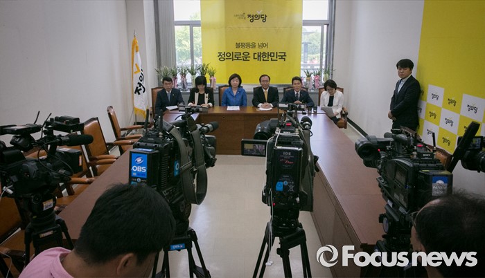 (서울=포커스뉴스) 20대 국회 임기가 시작된 30일 오전 서울 여의도 국회에서 심상정 정의당 상임대표와 노회찬 원내대표 등 의원단이 20대 국회 개원 기자회견을 하고 있다.