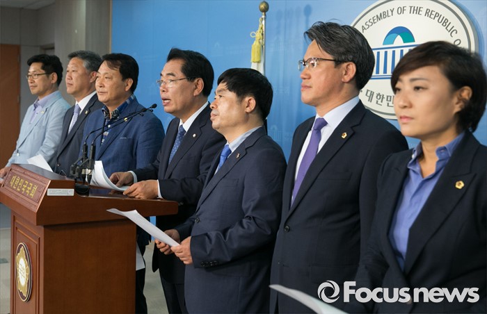 (서울=포커스뉴스) 백재현(오른쪽 네번째) 더불어민주당 의원과 경기도의회 예산결산특별위원회 의원들이 30일 오전 서울 여의도 국회 정론관에서 누리과정 예산 관련 갈등 해결 촉구 기자회견을 하고 있다.