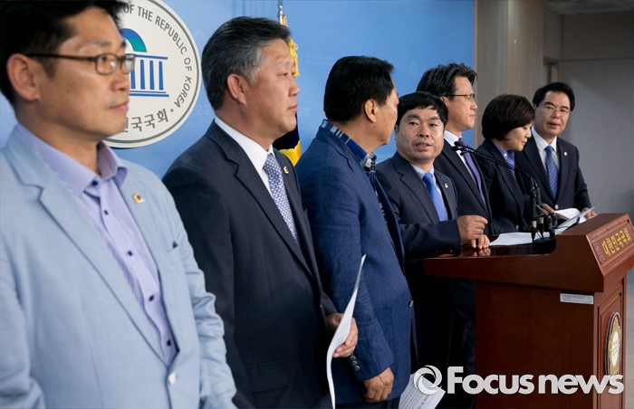 (서울=포커스뉴스) 백재현(오른쪽 첫번째) 더불어민주당 의원과 경기도의회 예산결산특별위원회 의원들이 30일 오전 서울 여의도 국회 정론관에서 누리과정 예산 관련 갈등 해결 촉구 기자회견을 하고 있다.