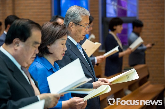 (서울=포커스뉴스) 김종인(왼쪽 세 번째) 더불어민주당 비상대책위 대표와 심상정(왼쪽 두 번째) 정의당 상임대표가 30일 오전 서울 중구 명동성당에서 열린 '국회의원 카톨릭 교우회 감사 미사'에 참석 하고 있다.