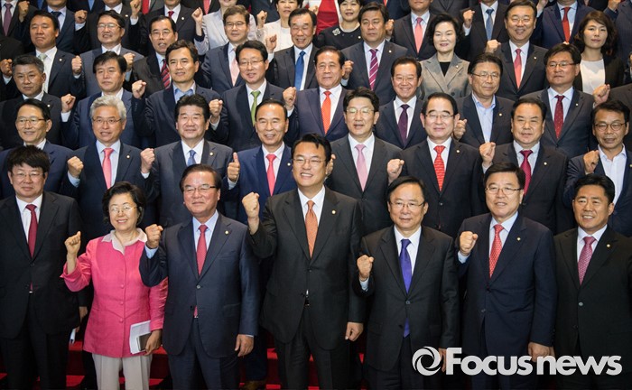 (서울=포커스뉴스) 정진석(앞줄 가운데) 새누리당 원내대표와 김광림(왼쪽 두번째) 정책위의장을 비롯한 새누리당 의원들이 30일 오전 서울 여의도 국회에서 기념사진을 찍고 있다.