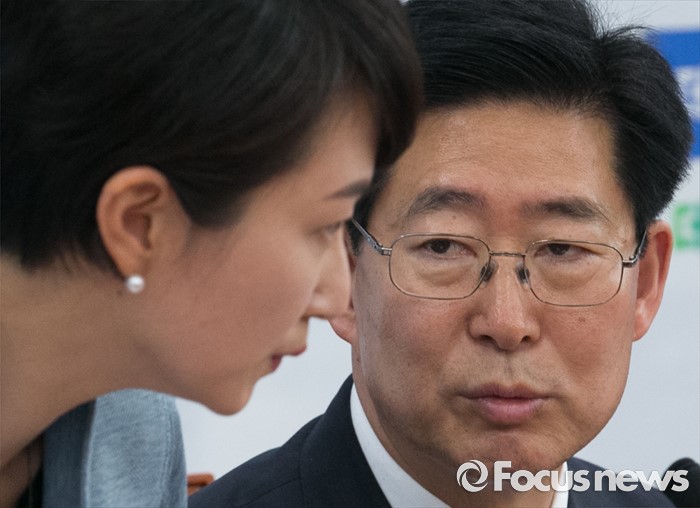 (서울=포커스뉴스) 30일 오전 서울 여의도 국회에서 열린 더불어민주당 가습기살균제대책특위 5차 회의, 가습기 살균제 피해 문제 해결을 위한 전문가 간담회에 참석한 양승조(오른쪽) 위원장과 이언주 의원이 대화하고 있다.
