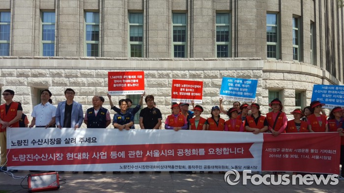 노량진수산시장 현대화 비상대책총연합회와 동작주민 공동대책위원회 등은 30일 오전 서울 중구 서울광장에서 기자회견을 열고 "노량진수산시장 현대화사업 등에 대한 시민공청회 청구운동을 시작하겠다"고 밝혔다.