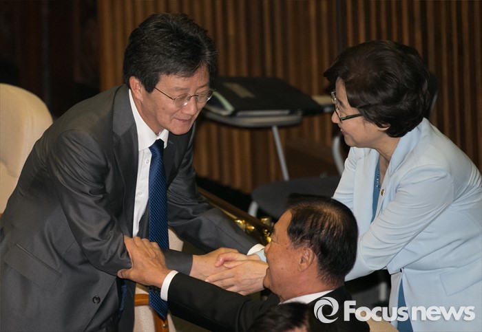 유승민 의원은 당선이 일주일도 지나지 않은 지난 4월19일 새누리당에 복당을 신청했지만 아직까지 심사는 이뤄지지 않고 있다.19일 오전 서울 여의도 국회에서 열린 342회 국회(임시회) 1차 본회의에 참석한 유승민(왼쪽) 무소속 의원이 새누리당 의원들과 인사하고 있다. 2016.05.19 박동욱 기자