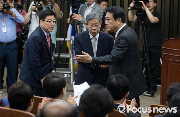 (서울=포커스뉴스) 정진석(오른쪽) 새누리당 원내대표가 30일 오전 서울 여의도 국회에서 열린 의원총회에서 김희옥 비상대책혁신위원장 내정자를 안내하고 있다.