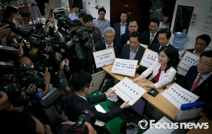 (서울=포커스뉴스) 20대 국회 임기가 시작된 30일 오후 서울 여의도 국회 의안과에서 김광림(오른쪽 첫번째) 새누리당 정책위의장, 신보라(오른쪽 두번째) 청년소통특위 부위원장 등 의원들이 당론 1호법안인 청년기본법과 규제프리존법, 서비스법 등 9개 법안 서류를 제출하고 있다.