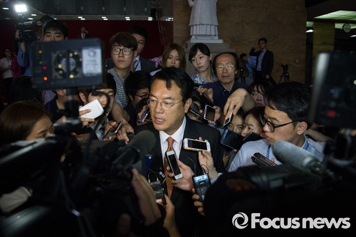 (서울=포커스뉴스) 정진석 새누리당 원내대표가 30일 오후 서울 여의도 국회에서 열린 의원총회를 마치고 국회를 나서던 중 취재진의 질문을 받고 있다.