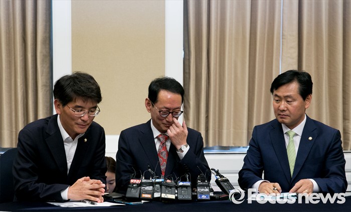 (서울=포커스뉴스) 30일 오후 서울 여의도 국회 귀빈식당에서 열린 20대 국회 원구상 협상 등을 위한 회동에 참석한 김도읍(가운데) 새누리당 원내수석부대표, 박완주(왼쪽) 더불어민주당 원내수석부대표, 김관영 국민의당 원내수석부대표가 생각에 잠겨 있다.