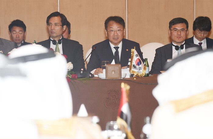 (서울=포커스뉴스) 유일호 부총리 겸 기획재정부 장관이 30일(현지시간) UAE 아부다비 St.REGIS호텔에서 열린 '제5차 한-UAE 경제공동위'에 참석, 답사를 하고 있다. <사진제공=기획재정부>