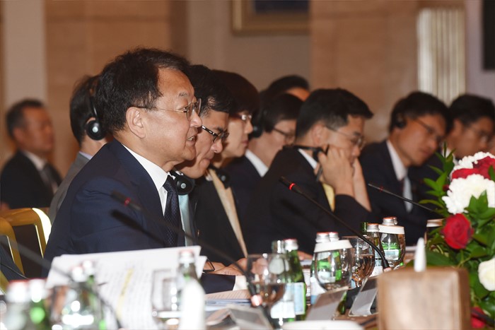 (서울=포커스뉴스) 유일호 부총리 겸 기획재정부 장관이 30일(현지시간) UAE 아부다비 St.REGIS호텔에서 열린 '제5차 한-UAE 경제공동위'에 참석, 답사를 하고 있다. <사진제공=기획재정부>